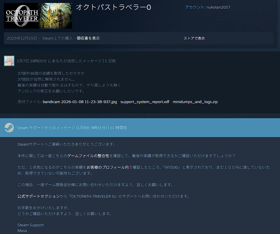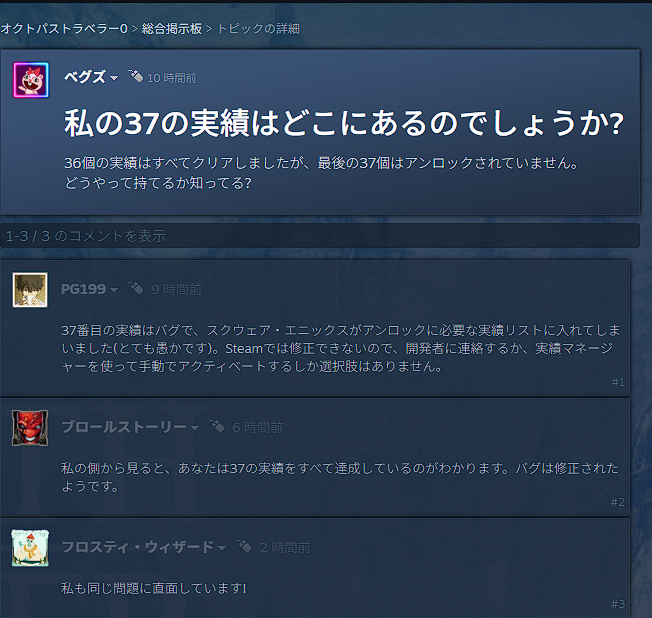 26/01/09 Steam版オクトパストラベラー0 37個目の実績「きみが創った物語」が取得出来ないバグが発生 PART2