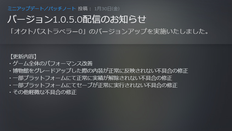 26/01/08 Steam版オクトパストラベラー0 「きみが創った物語」が取得出来ない実績バグが発生